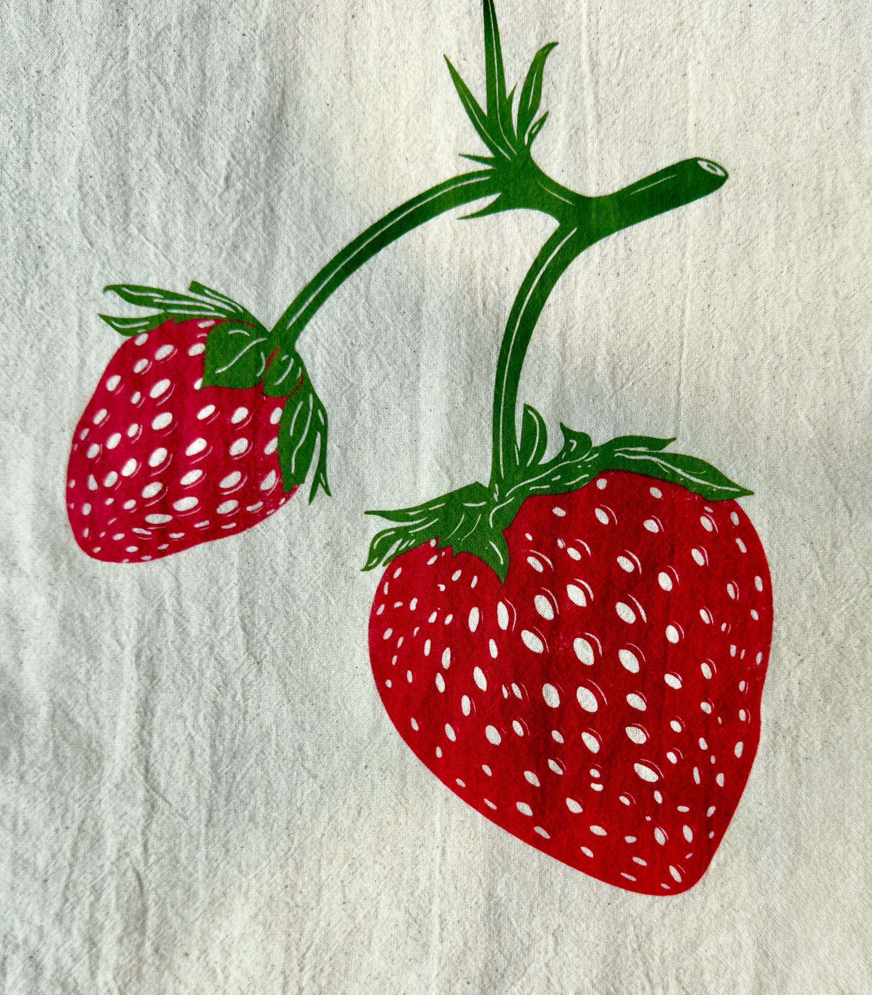 Our original strawberry design is hand screen printed onto each towel. Each towel features delicious strawberries printed with water based ink.