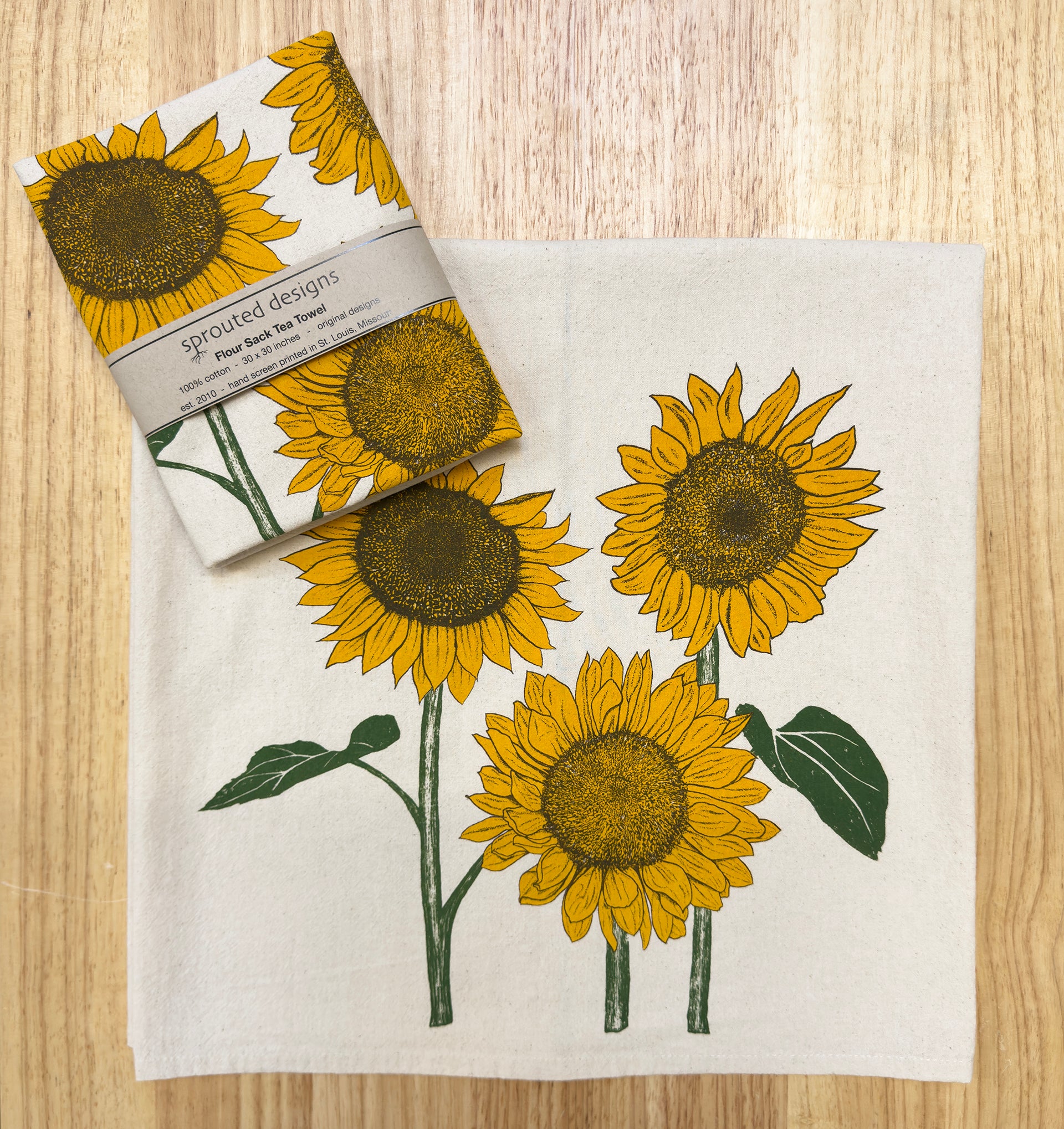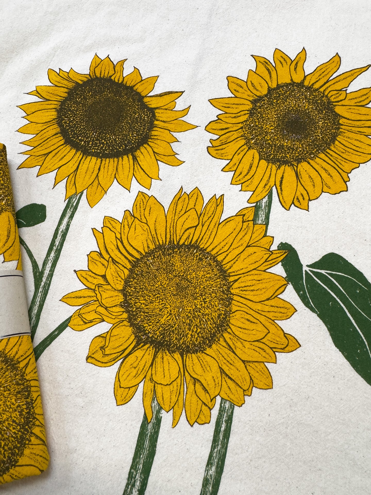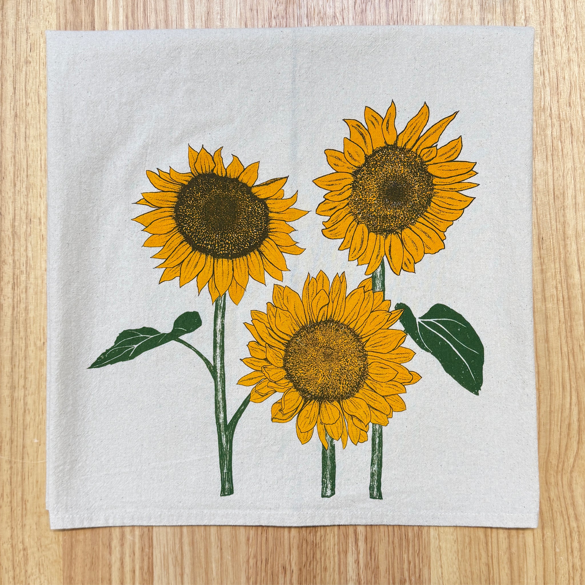 Our original Sunflower design is hand screen printed onto each towel. Each towel features beautiful sunflowers printed with water based ink.